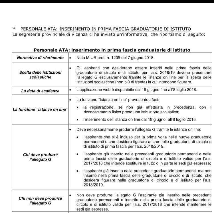 | Scelta delle istituzioni scolastiche | · Gli aspiranti che desiderano essere inseriti nella prima fascia delle graduatorie di circolo e di istituto per l’a.s. 2018/19 devono presentare l’allegato G esclusivamente tramite le istanze on line per la scelta delle istituzioni scolastiche (non più di trenta) in cui intendono figurare. |