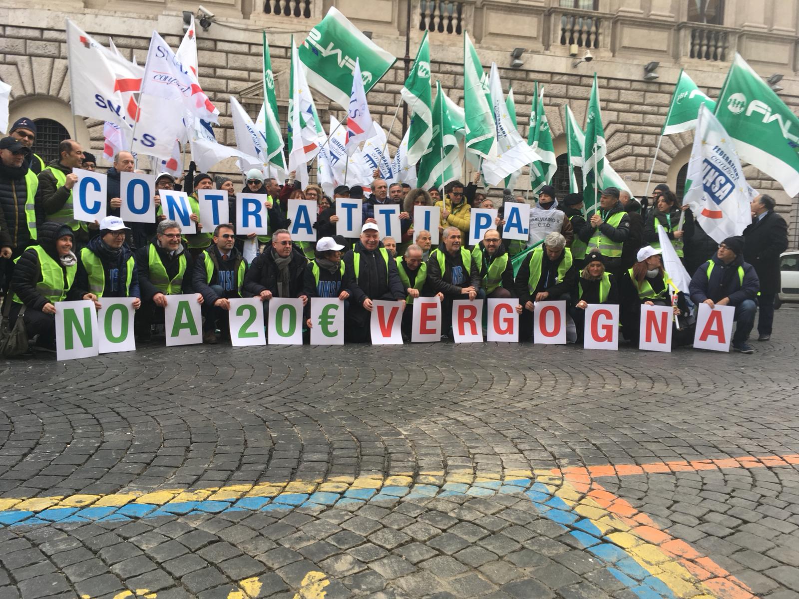 Elvira Serafini, Segretario generale SNALS-Confsal, Massimo Battaglia, Segretario generale Confsal-UNSA, e Giuseppe Carbone, Segretario generale FIALS-Confsal, hanno parlato ad un nutrito gruppo di persone fuori Palazzo Vidoni con lo slogan: “No a 20 euro per il rinnovo del contratto”.