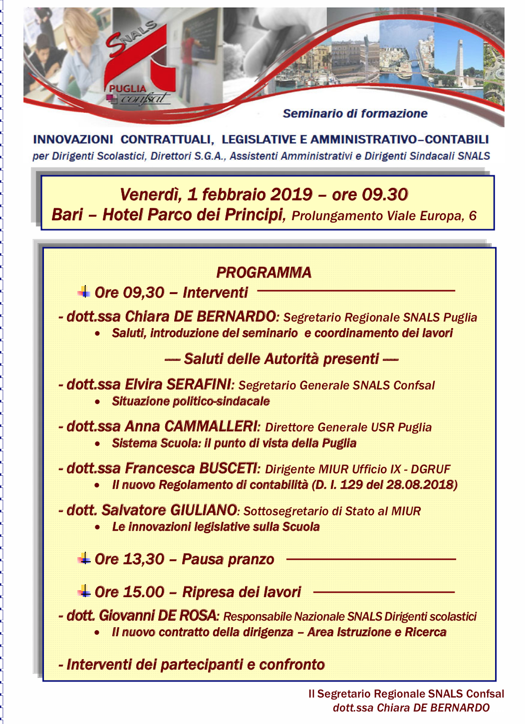 Lo SNALS Regione Puglia organizza un Seminario di formazione per Dirigenti Scolastici, Direttori SGA, Assistenti Amministrativi e Dirigenti sindacali SNALS.
