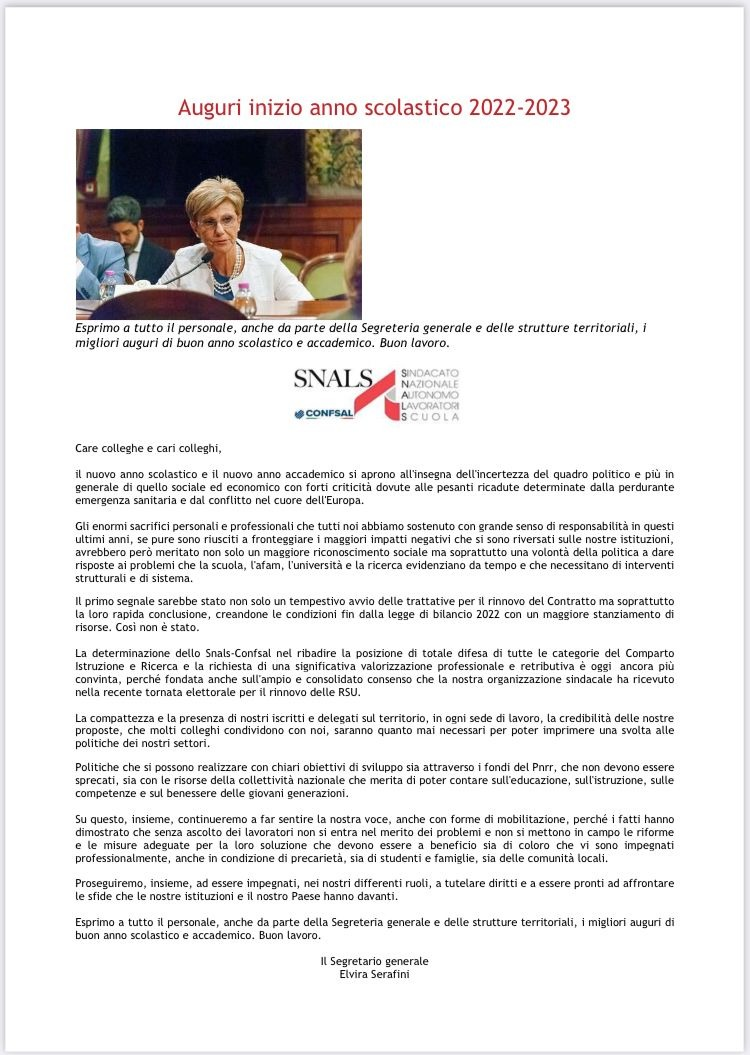 By Pier Caressa|2022-08-31T19:26:05+01:0031 Agosto 2022|News|Commenti disabilitati su AUGURI INIZIO ANNO SCOLASTICO DEL SEGRETARIO GENERALE SNALS